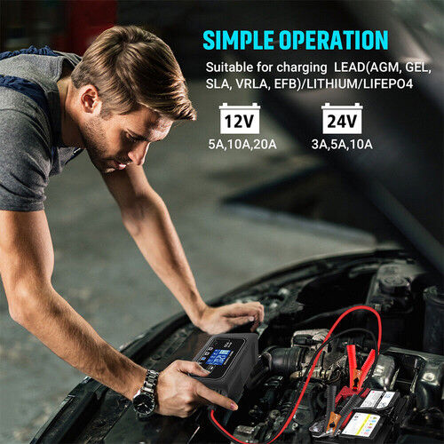 20-AMP QUICK CHARGER: 12V 20-Amp and 24V 10-Amp 7-stage quick battery charger, charging speed is much faster than 8-Amp or 5-Amp automatic chargers. Charge or repair all 12-volt and 24volt lead-acid or lithium-ion or LiFePO4 automotive, marine and deep-cycle batteries including AGM, GEL, SLA, Flooded in cars, trucks, SUVs, motorcycles, lawn mowers, boats, etc.