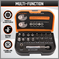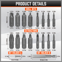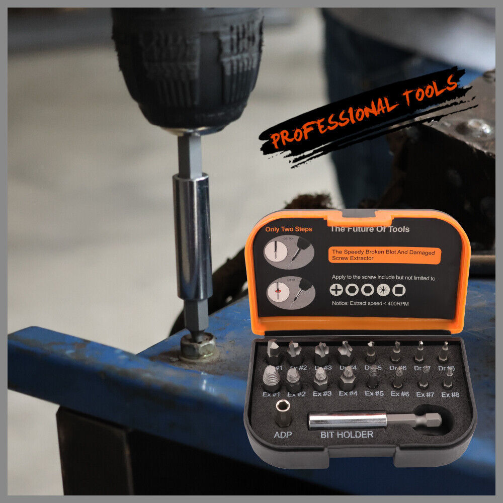 The set to include various sizes of extractors, a socket adapter (labeled "ADP"), and a bit holder.