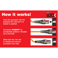 Simply push the IEC Lock C19 connector into any standard C20 connector and it is locked in position. The connector cannot be accidentally pulled out or vibrated out of the inlet. To remove, simply slide back the 'red' tab to release the lock mechanism and remove the connector from the inlet.