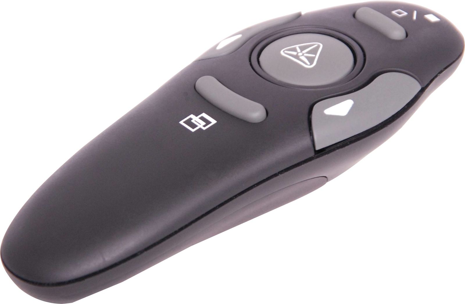 This ergonomic presentation controller/clicker replicates the four control buttons of Microsoft PowerPoint®. 2.4GHz wireless USB dongle allows freedom up to 10m from your laptop. Includes laser pointer function, next, previous, escape/resume and dark screen button controls. Requires no drivers to operate. USB plug and play, no driver required.