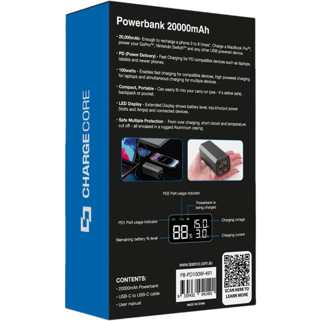 Keep your devices powered up while on the go with the Laser 20,000mAh Powerbank with Power Delivery (PD).
