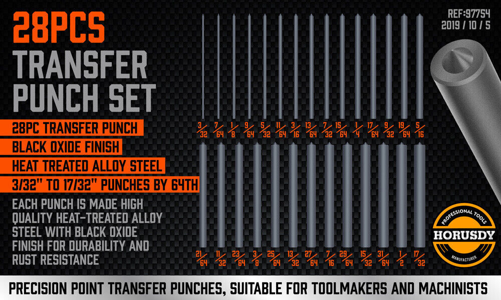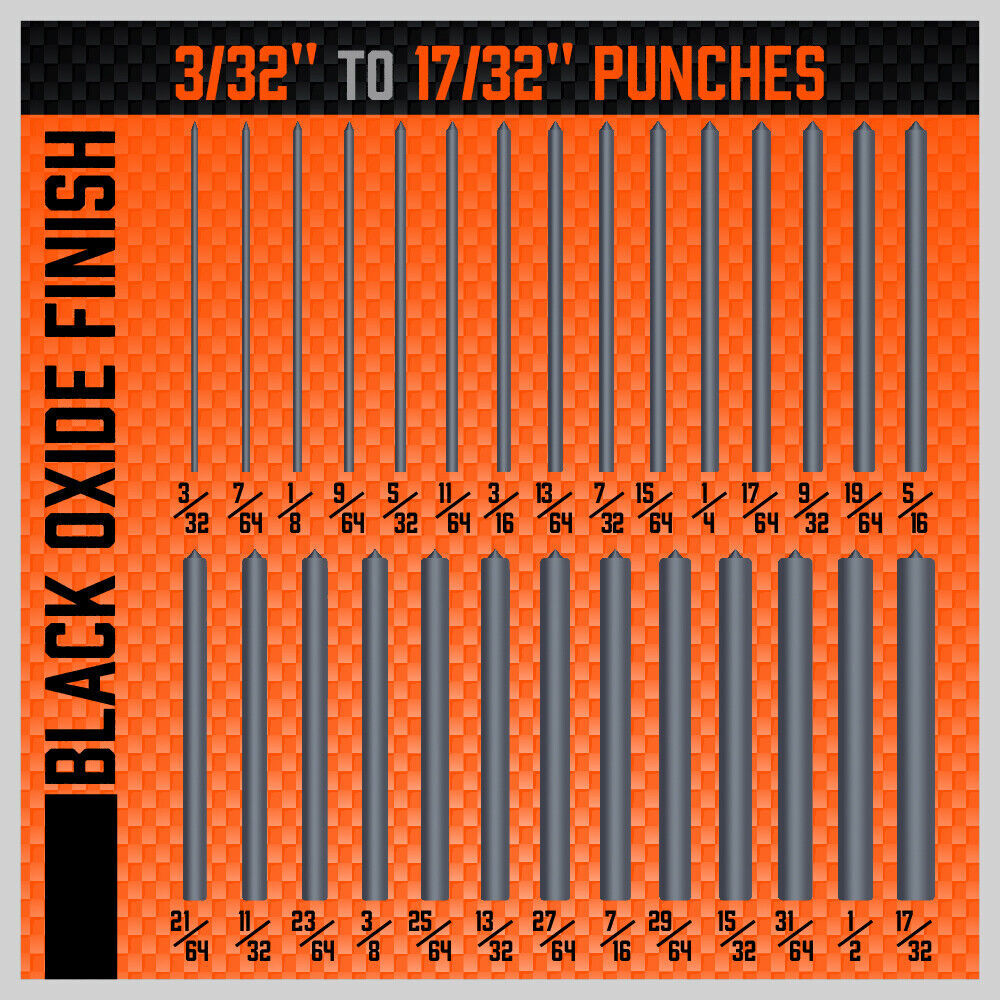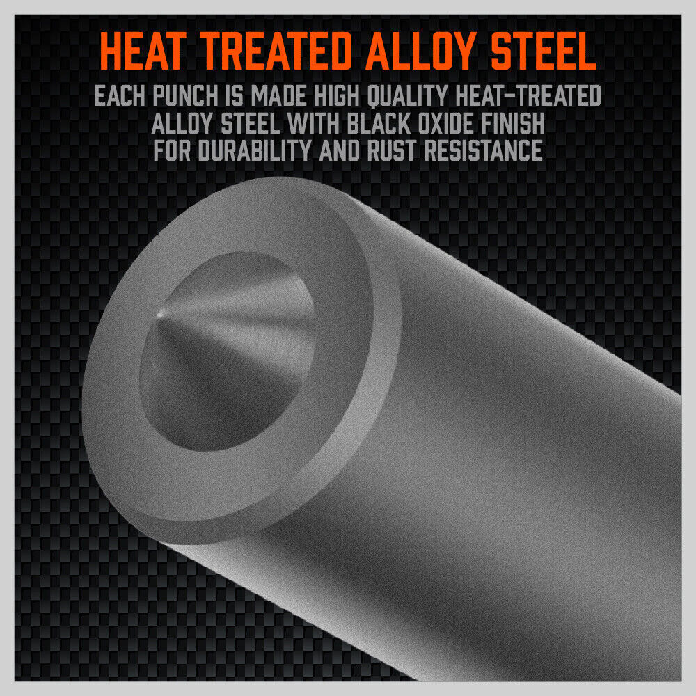 • Each punch is made high quality heat-treated alloy steel with black oxide finish for durability and rust resistance