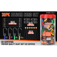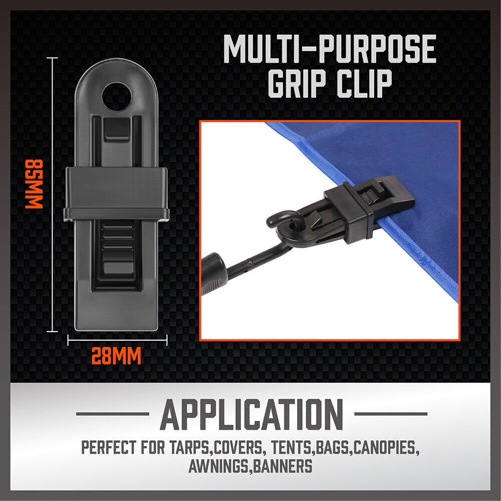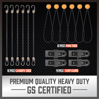 Secure your tarps, awnings, and camping equipment with our premium 30-piece Bungee Cords Awning Tarp Clips Set. Made from super elastic rubber rope, these cords provide exceptional durability and strong elasticity. The ABS-coated hook prevents scratches on your car, while the rugged properties of the cords ensure long-term use. The set includes 4 crocodile mouth tarp clips, designed to securely clamp and release tarpaulins of various thicknesses. With multiple sizes available, including 10", 18", 24", 32", and 40" cords, as well as UV resistant cord jacket canopy ties, you'll have the perfect solution for any tying or securing task. The color-coded cords allow for easy identification of the required length. Ideal for tents, tarps, canopies, garages, roofs, walls, pipes, fishing rods, screens, shelters, and more. GS certified for premium quality and heavy-duty performance.