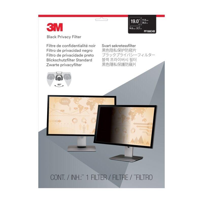 3M Privacy Filter PF190C4B standard 19'' monitor helps protect confidential information from prying eyes. Screen data is visible only to persons directly in front of the monitor, with no blurring or image distortion. 1 year warranty.