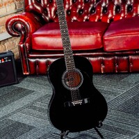 The included guitar is a standard acoustic with a dreadnought shape and steel strings, providing excellent tone and projection. The guitar comes in a glossy Black colour, with strap buttons on the body and neck for standing play, and a standard acoustic guitar bridge with pins.