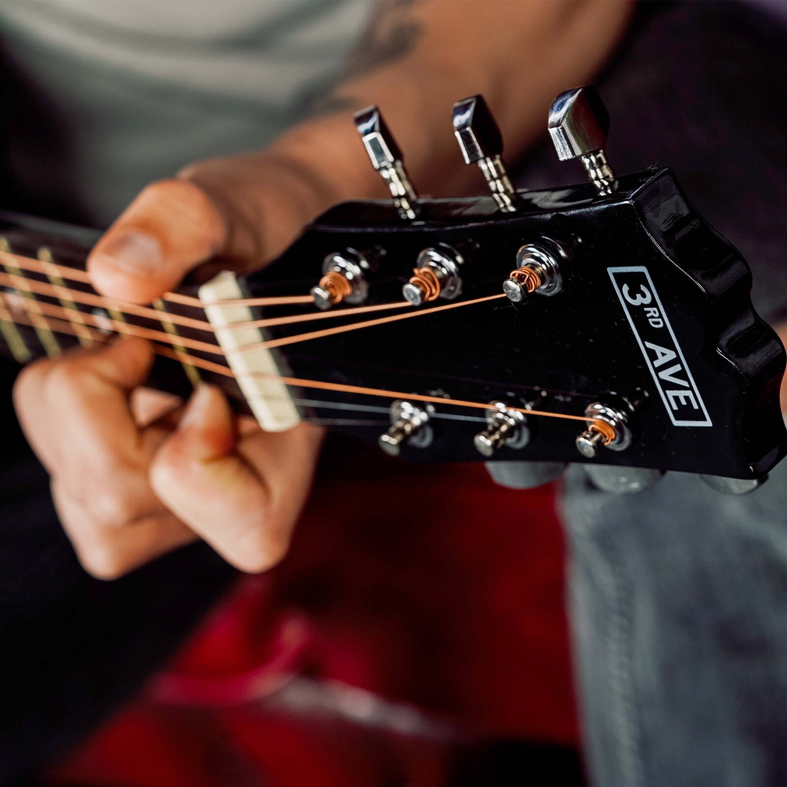The 3rd Avenue Premium Acoustic Guitar Pack offers all of the essential and luxury accessories to start your guitar-playing journey. It includes a full-size 3rd Avenue acoustic guitar, a gig bag with a front zipper pocket, extra strings, a couple of guitar picks, and a guitar strap for standing play. The pack also features a sturdy guitar stand for displaying your instrument, a trigger capo, and a string winder for easy string changes.