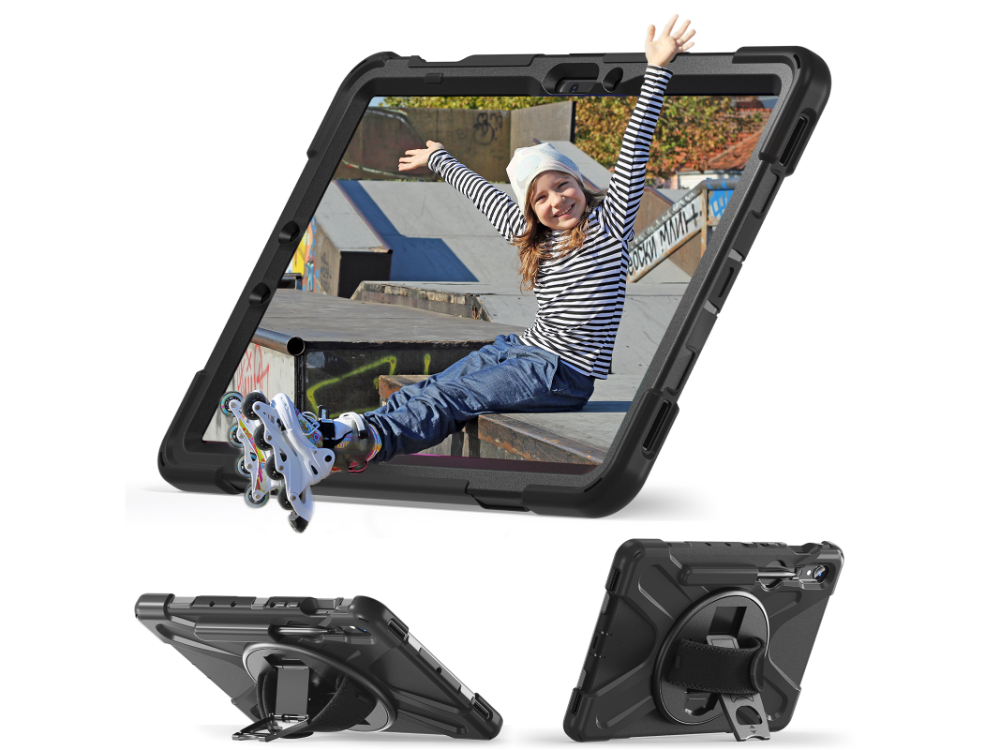 • This two-piece case design cradles your precious device between a hard inner shell and impact-resistant outer silicone cover. The two materials work tirelessly to protect your device 24/7. Flip the case over to uncover a built-in 360° rotatable plate that includes an adjustable hand strap and kickstand for any occasion.