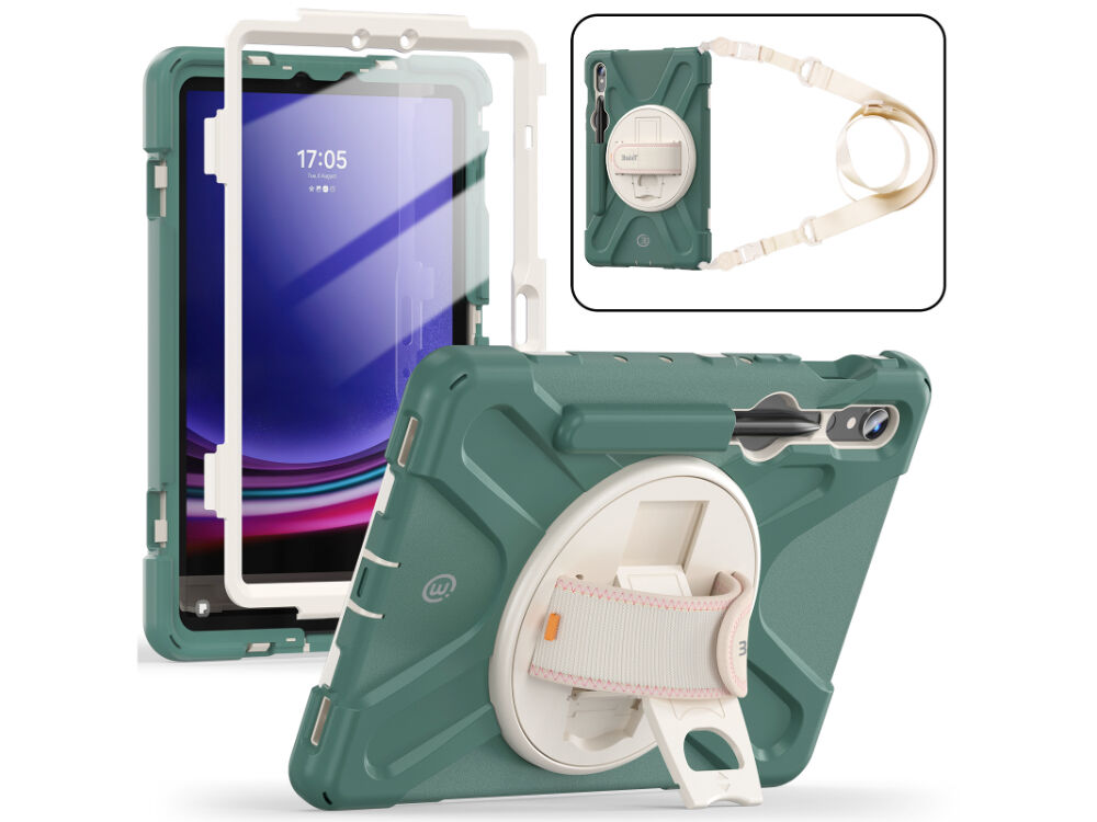 Compatibillity:Galaxy Tab S10 Lite Galaxy Tab S10 FE Galaxy Tab S9 FE|Overview:Protect your Galaxy Tab S10 Lite with confidence using this rugged tablet case designed for durability versatility and everyday practicality. Whether you're on the go at work in the classroom or hands-free at home this case offers full protection while enhancing the way you use your tablet. Built with shockproof materials and a built-in stand it keeps your device secure during drops bumps and rough handling. The 360° rotatable kickstand shoulder strap and hand strap offer comfortable and flexible ways to carry or use your tablet in any environment.|Features:Built-in screen protector for scratch and dust protection Shockproof drop-resistant design with reinforced corners 360° rotatable kickstand for horizontal or vertical viewing Adjustable and detachable shoulder strap for hands-free carrying Velcro hand strap for secure one-handed use Camera and volume button protection with raised bezels Precise cutouts for charging port speakers and buttons Anti-slip durable rubber exterior for a secure grip Full-body rugged protection ideal for kids worksites classrooms and travel|
