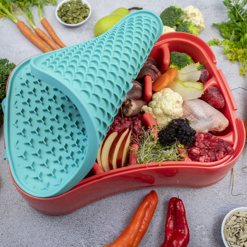 - 4-in-1 system: Slow feeder, lick mat, food prep lid, and travel bowl