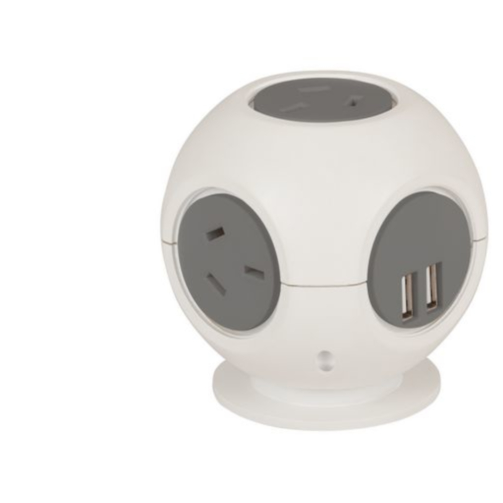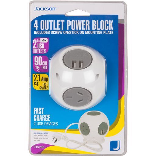 This unique and compact Power Block features 4 mains power outlets and two USB charging outlets. Complete with sturdy mounting plate that can be affixed to a flat surface by using the tape supplied or secured using the screw mounts.