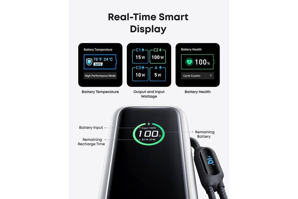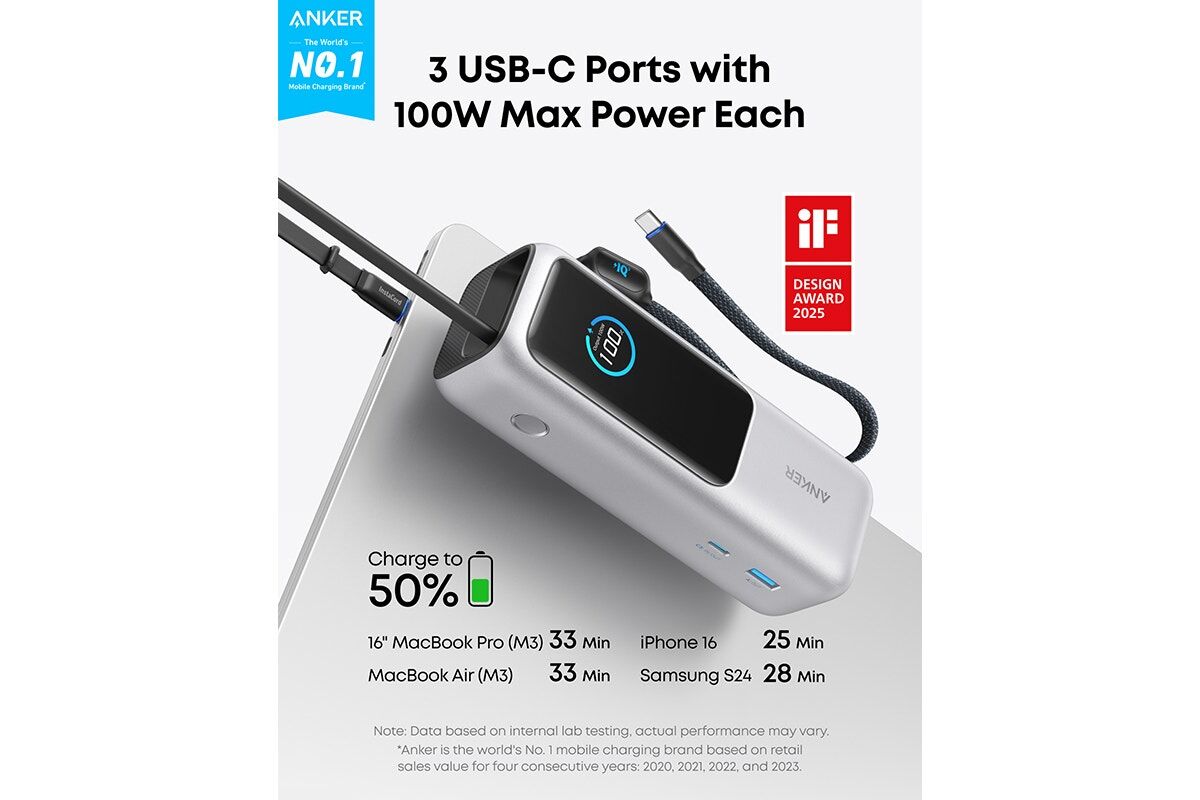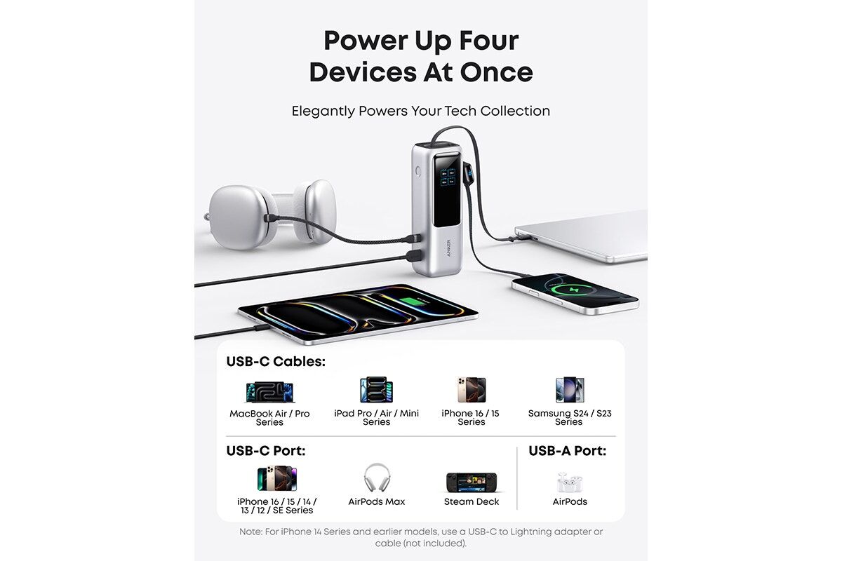 The Anker 25K 165W Power Bank with Built-in Retractable Cables delivers powerful, fast charging on the go. With 165W output, high capacity and integrated cables, it offers ultimate convenience and portability for all devices.