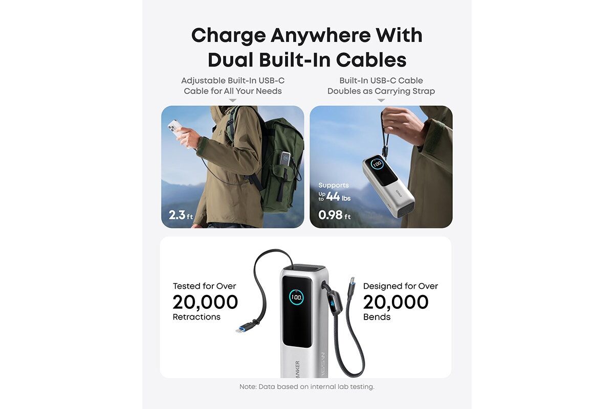 Stay organised and travel light with 2 built-in USB-C cables. One extends up to 2.3ft with over 20,000 retractions, while the shorter 0.98ft cable doubles as a strong, flexible carrying strap that withstands more than 20,000 bends.