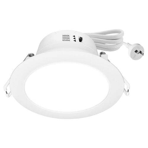 This Arlec LED Downlight features a Tri-Colour function. Slide the switch at the back of downlight to set the default colour temperature of your choice before installation. The product is fitted with a lead and plug for easy installation and the dimmable LED driver is suitable for use with trailing edge, and universal dimmers