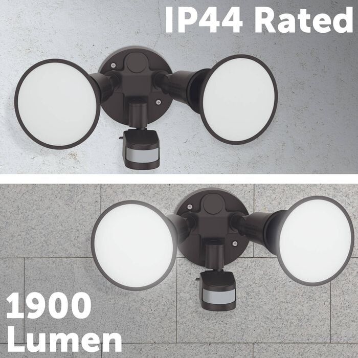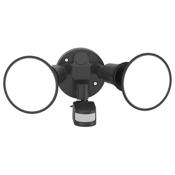 The Arlec Twin LED PAR38 Security Flood Light with PIR Motion Sensor includes two 10W LED PAR38 globes boasting a total lumen output of 1900 lumens. Features a sensor detection range of 10 metres, with an adjustable lighting time of between 5 seconds and 5 minutes as well as Manual override function. With IP44 Weather rating, this security light is suitable for under the eve outdoor Installation: Wall mounted or Ceiling/Eve mounted. This security light requires hardwired installation. Installation and wiring must be performed by a licensed Electrician.