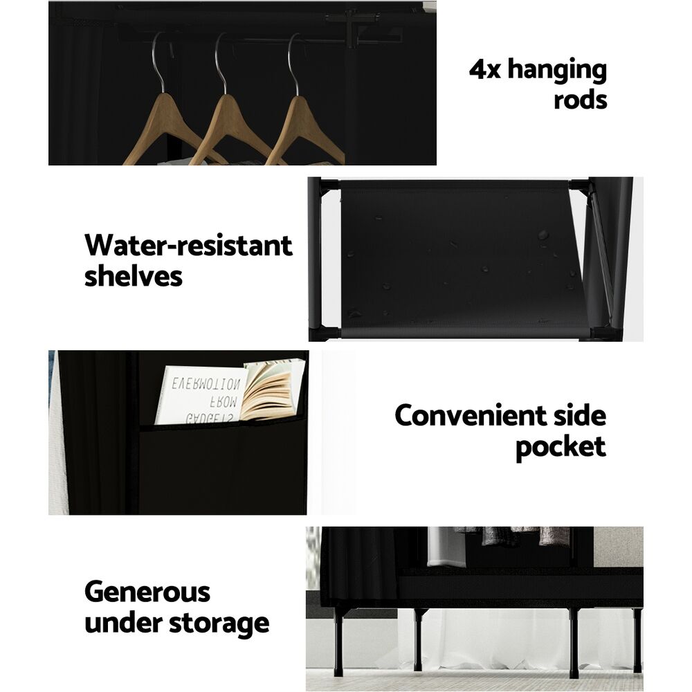 For an easy and affordable furniture solution, look no further than the Artiss DIY Fabric Wardrobe. Made from premium non-woven fabric with a zipper and curtain design, the piece has the capacity of a traditional wardrobe at a fraction of the cost. A sturdy metal frame and non-slip feet keep your wardrobe standing tall and strong, while the water-resistant shelves prevent the growth of mould, mildew and bacteria. Four hanging rods will hold your favourite suits, dresses and shirts, convenient side pockets hold your smaller essentials, and you'll find generous underneath storage space for shoes and boots. Best of all, you can adjust the panels for your individual storage needs. With completely tool-free assembly, it's never been easier to keep your room organized with Artiss.