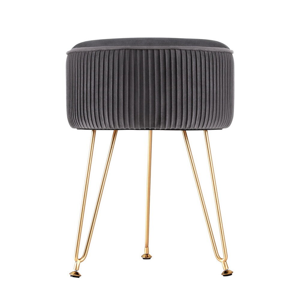 Round velvet Artiss footstool with vertical stripe design, durable MDF frame, and high-resilience foam padding. Features protective metal legs and simple assembly.