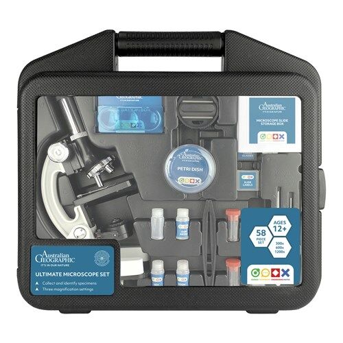 Set Includes: Microscope with LED light, mirror and colour filters, 1 incubation box, 1 petri dish, 1 razor blade, 1 measuring cylinder, 3 collection vials, 3 specimens in bottles, 1 specimen storage box, 4 prepared slides, 8 blank slides, 14 cover glasses with case, 14 blank labels with case, 1 pair of tweezers, 1 safety scalpel, 1 dropper, 1 pointer, storage case and instructions.