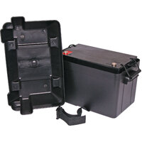 This automotive / marine plastic battery box (27M type) suits 90-100Ah batteries and is made from a non-corrosive, high-density, reinforced black, polyethylene material which is impervious to battery acid. The battery box features sturdy carry handles and vented lid that has 4 recesses for battery leads. It also includes a webbing strap with adjustable quick release plastic buckle. With this battery box you will be able to protect your boat & secure your battery in place.