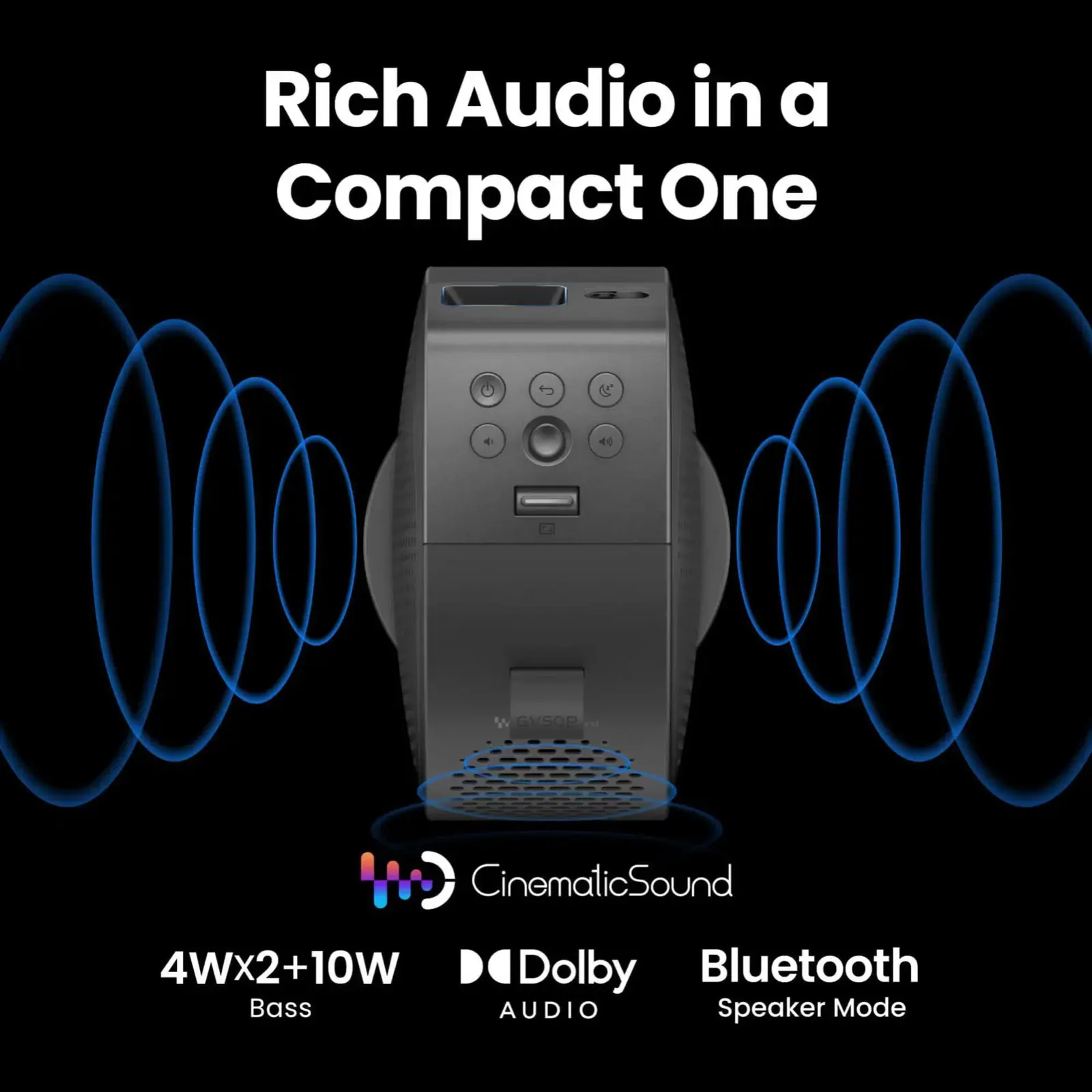 BenQ GV50P 1080P, Laser, DLP, Portable Projector, 1920x1080 Resolution, 500 Lumens, 100,000:1 Contrast, Black, Google TV (Android 11) + Remote + Case.GV50P’s flexible base design, similar to an integrated tripod, is tailor-made for bedside ceiling projection, offering you the freedom to project from any desired angle while relaxing in the comfort of your bed.Tilt GV50P's adjustable base to project from the bedside table, ensuring optimal visual positioning without worrying about instability, while also freeing up space on your bed. Effortlessly rotate the projector body with 135 degree Vertical Adjustment directly from its stable base, seamlessly transitioning from wall projection to ceiling display. Efficiently utilise bedroom space by positioning GV50P at either end of the bed. Simply rotate the device 180 degrees, Google TV.