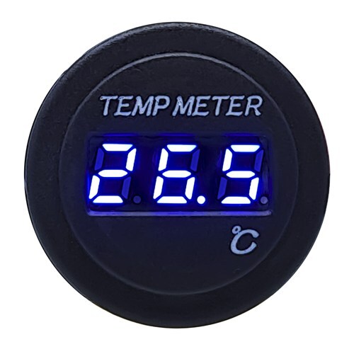 A quick and simple way to monitor temperature in a vehicle, this panel mount guage displays the temperature being picked up by the probe thats mounted to a handy 3m cable so it can be run behind a dash into the engine bay. Simply wire up to a DC power source between 12-24VDC, and the blue LED display will show current temperature.
