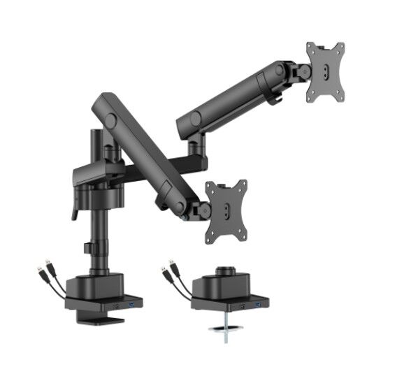 Brateck LDT84-C024UCP-B DUAL SCREEN POLE-MOUNTED HEAVY-DUTY MECHANICAL SPRING MONITOR ARM WITH USB PORTS BLACK (new) FEATURES ●Free-Tilting Design: makes easy forward or backward adjustment for better viewing and reduced glare ●360° Rotary VESA Plate: for more viewing experience ●Built-in Spring Tension Mechanism: for perfect weight adjustments ●Built-in Cable Management: for an organized and neat workspace ●Smooth Arm Insertion: ensures easy installation ●Swiveling Arm(s): offer(s) maximum viewing flexibility (makes every seat the best seat) ●Detachable VESA Plate Design: enables easy installation ●Installs from Top Side: installs entirely from above the desk surface ●Smart Base with USB-A & USB-C Ports: snap-off plates on the base provide data throughput or to charge devices ●Two Mounting Options: both desk clamp and grommet are included SPECIFICATIONS Product Category: Mechanical Spring Monitor Arm Rank: Standard Material: Aluminum,Steel,Plastic Surface Finish: Powder Coating Color: Matte Black Dimensions: 1066x120x697mm (42'x4.7'x27.4') Fit Screen Size: 17'-35' Fit Curved Monitor: Yes Screen Quantity: 2 Weight Capacity (per screen): 2~12kg (4.4lbs~26.4lbs) Weight Capacity for Curved Screen (per screen): 2-11kg (4.4lbs-24.2lbs ) VESA Compatible: 75x75,100x100 Tilt Range: +45°~-45° Swivel Range: +90°~-90° Screen Rotation: +180°~-180° Arm Full Extension: 514mm (20.2') Pole Height: 362mm (14.3') Installation: Clamp,Grommet Suggested Desktop Thickness: Clamp:10~50mm Grommet:10~50mm (Clamp:0.39'~2' Grommet:0.39'~2') Quick Release VESA Plate: Yes USB Port: 1xUSB 3.0 Port,1xTYPE-C Cable Management: Yes Accessory Kit Package: Normal/Ziplock Polybag,Compartment Polybag