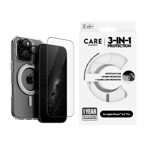 Overview:Want to protect your phone? I mean REALLY protect your phone? Then this 3-in-1 protection pack from PanzerGlass® is for you! Featuring Care’s most anticipated new product the kickstand case UWF Ceramic Screen Protector and a Hoops™ Camera Lens Protector this pack shields your phone from scratch-creating bumps against sharp-edged corners phone-cracking falls onto stone-hard pavements and just about anything else life might throw at you. The screen protector even has a smudge-free coating that reduces traces of fingerprints and grease and the kickstand is versatile for hands free viewing both vertically and horizontally.|Features:- 4 x Military Grade Standard (MIL-STD-810H) - Tested with a drop height of 4.8 meters or a rock-climbing-or-working-on-a-scaffolding-and-accidently-dropping-my-device kind of height. - Scratch resistant - Protects your device from scratching caused by the hazards of everyday life. - Shock resistant - Keeps your device safe from your everyday fumbling dropping and screen cracking. - Anti-yellowing - Designed specifically to prevent yellowing even after long time use. -100% touch sensitivity = Feels like the original screen with 100% touch sensitivity. - Comes with an EasyAligner that makes installation so simple you can do it perfectly even if you’re all thumbs. - Fingerprint resistant = Repels oil and water reducing traces of fingerprints as well as dirt disinfectant gel and hand lotion.|