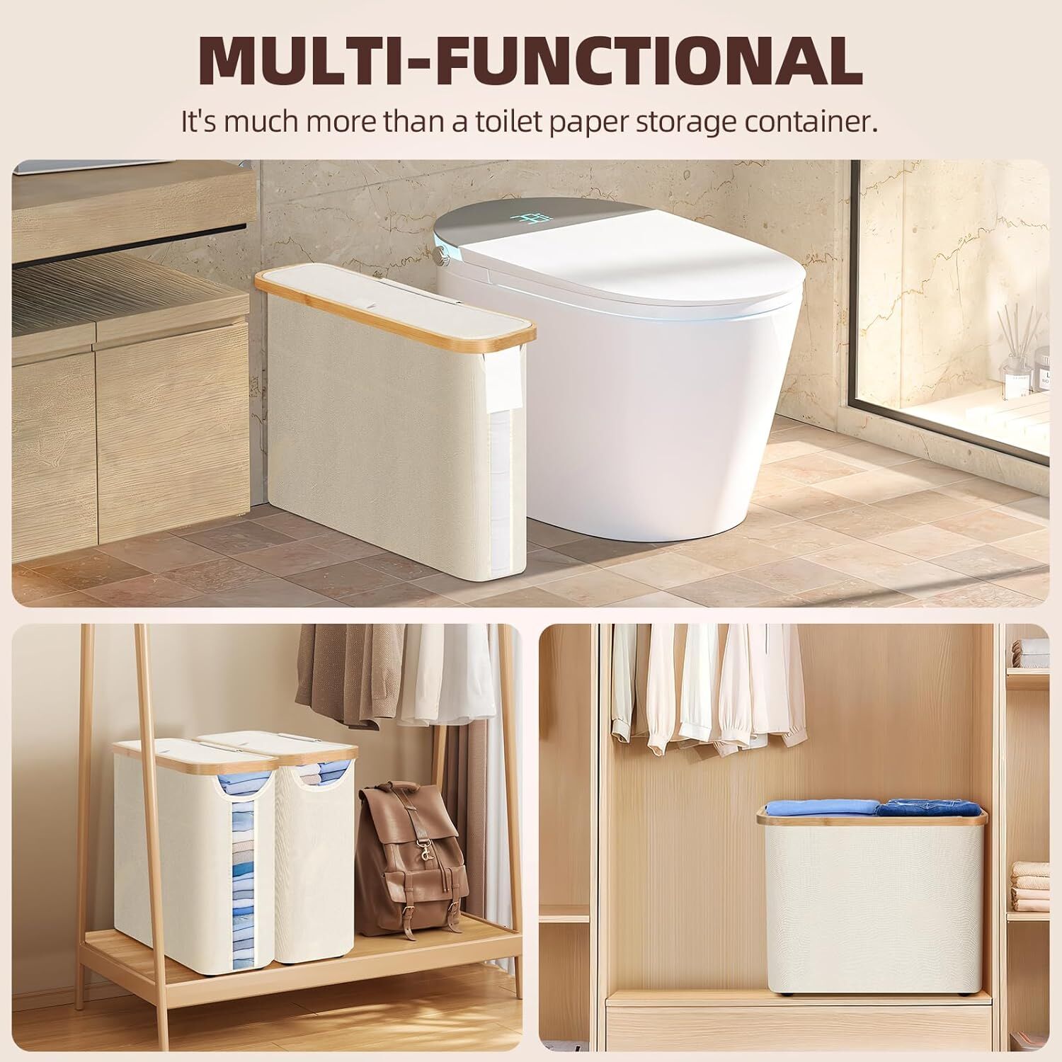 CARLA HOME Toilet Paper Storage Basket Holds Up to 12 Rolls with Bamboo Lid and Handle for RV Closet (White)