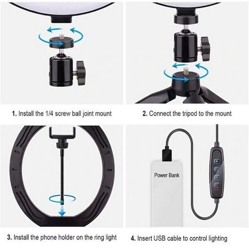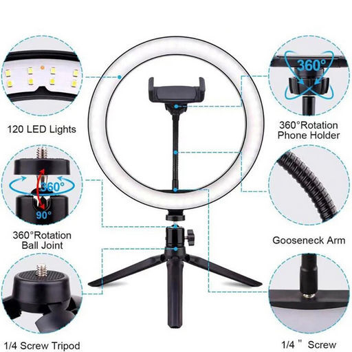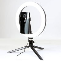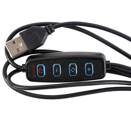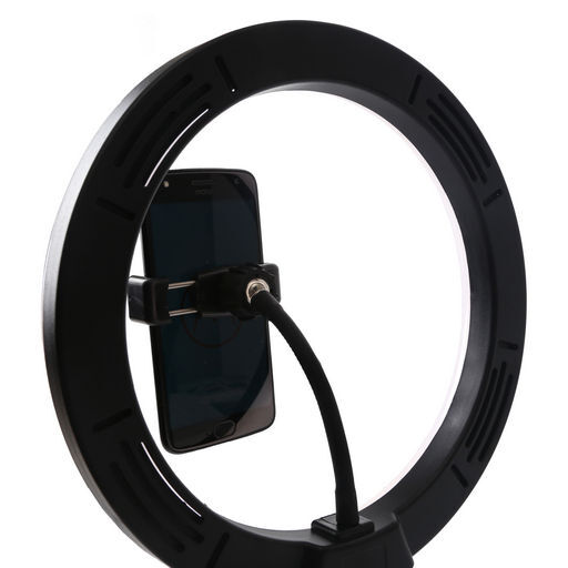 This 10" LED ring light will give you excellent illumination centred on the subject to focus the attention and reduce shadows so images are bright and balanced. By removing harsh shadowing or low contrast, it gives your online personal videos and photos a professional look. This ring light gives efficient brightness from 10W of circular LED lighting that is evenly diffused. Includes standard photography 1/4" mount, a ball & socket adjustable hinge on a stable desk-stand plus an adjustable cradle to hold your phone in the centre of the light source. Ideal for video bloggers wanting a professional look to their videos with a simple lighting solution for best results and improves video conferencing with excellent illumination. USB Type A plugs into any 2.1A USB power supply (not included).Includes inline controller to adjust brightness and colour temperature.