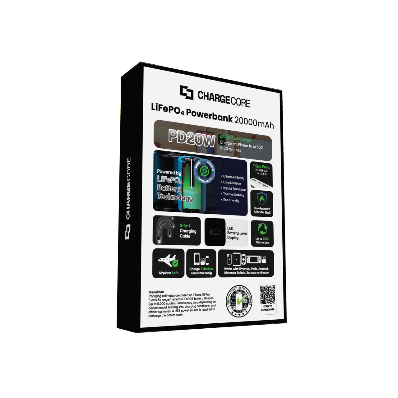 The ChargeCore SafeCharge Max 20000mAh White power bank uses advanced LiFePO4 technology for enhanced safety, durability, and a longer lifespan, delivering reliable power for years.