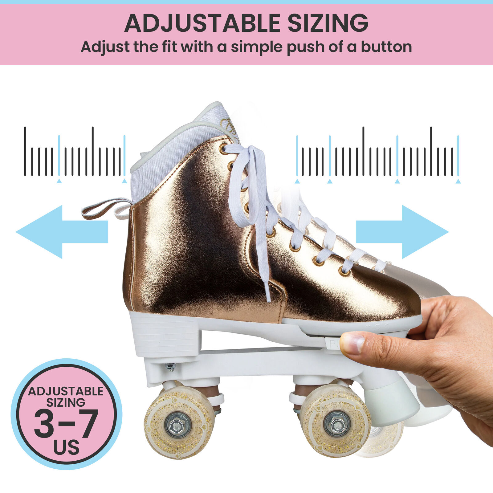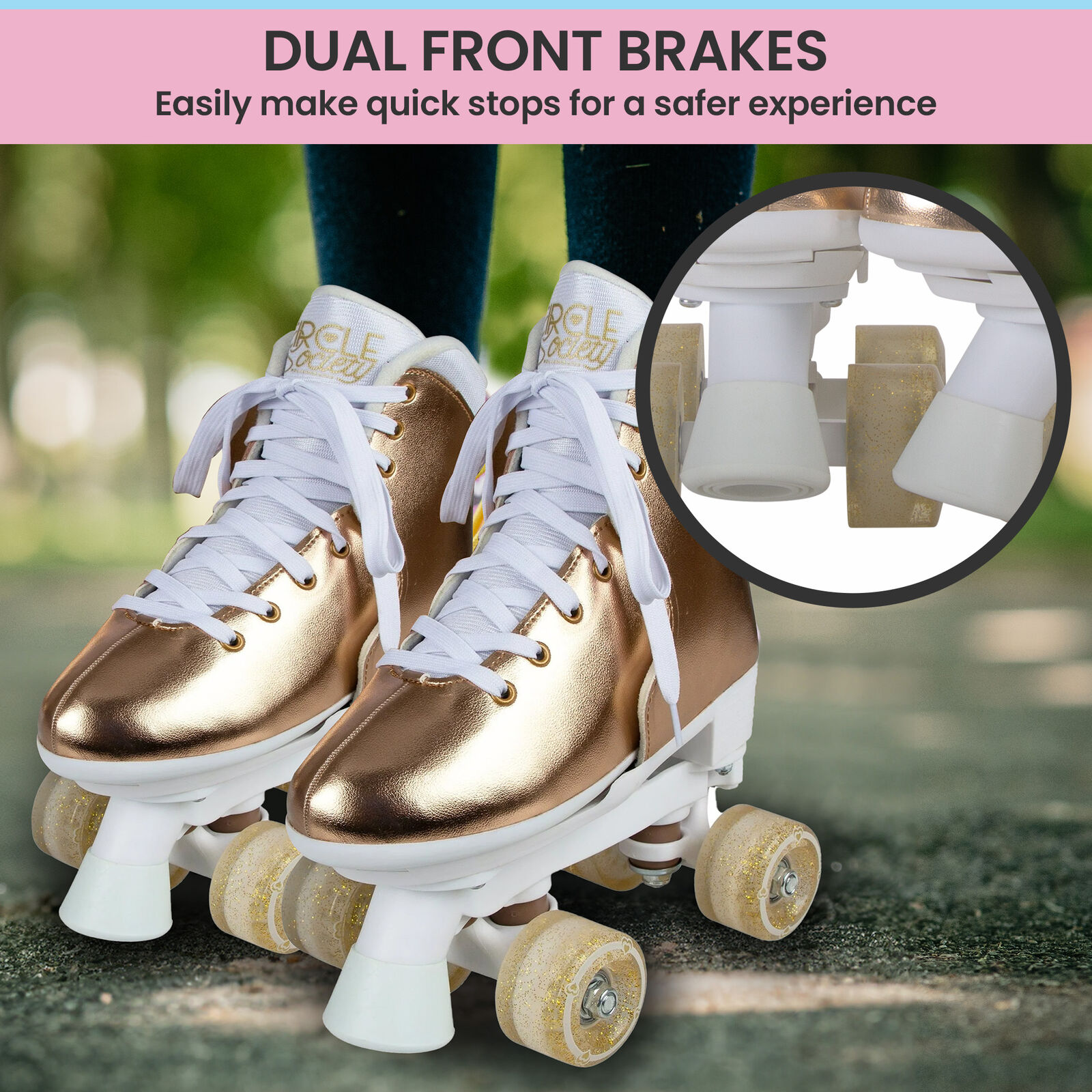 Skate through the streets with great flair, sporting Circle Societys Adjustable Roller Skates! Featuring a vibrant design and smooth-rolling polyurethane wheels, these skates are perfect for indoor and outdoor adventures. With an easy-push button for adjustable sizing (US sizes 3-7) and ABEC 7 sealed bearings, youll be grooving down the rink with a snug fit and reliable performance. Plus, dual front brakes ensure safety and control during every ride. So whatre you waiting for? Strap on and let the good times roll!