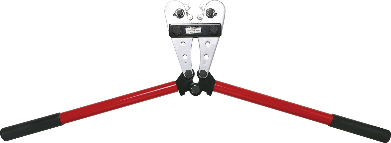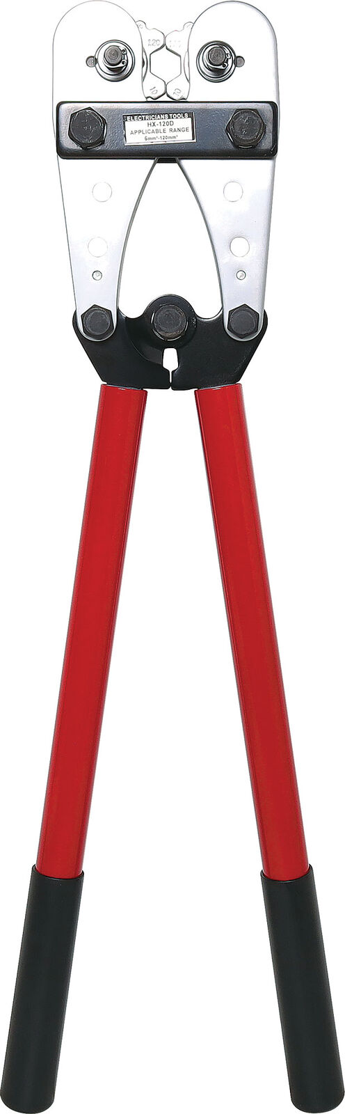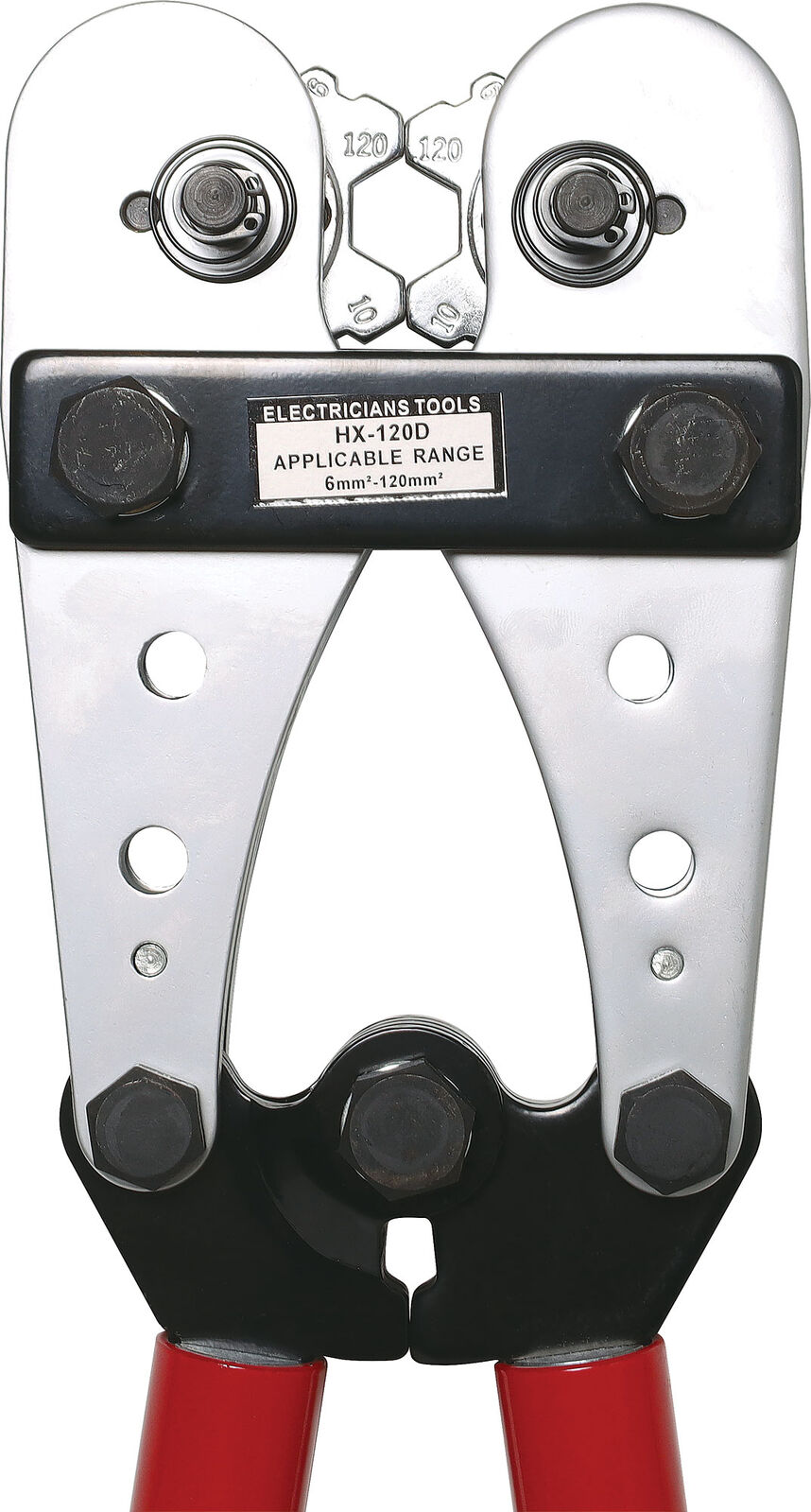 This 620mm long, rugged cast steel crimper is designed for uninsulated cable lugs and Anderson plugs. It suits cable size 6mm2 to 120mm2 and lug sizes 6mm, 10mm, 16mm, 25mm, 35mm, 50mm, 70mm, 95mm, 120mm and is commonly used for making high current battery leads in solar installations. The rotating jaws allow easy changes between crimping size.