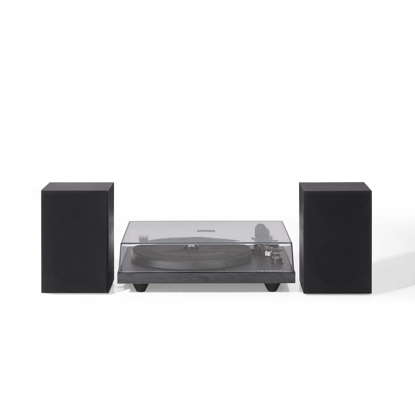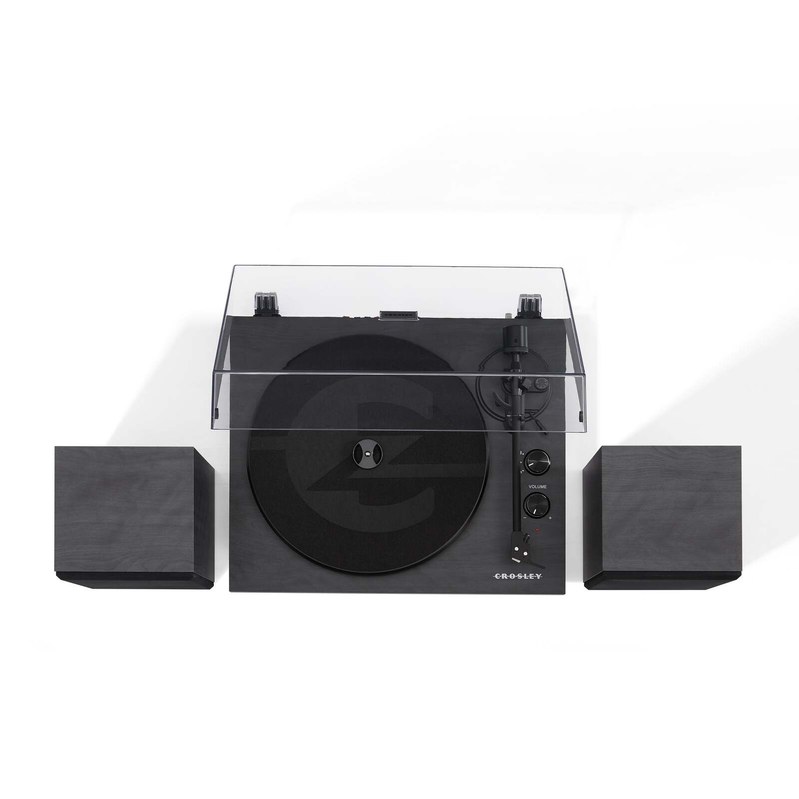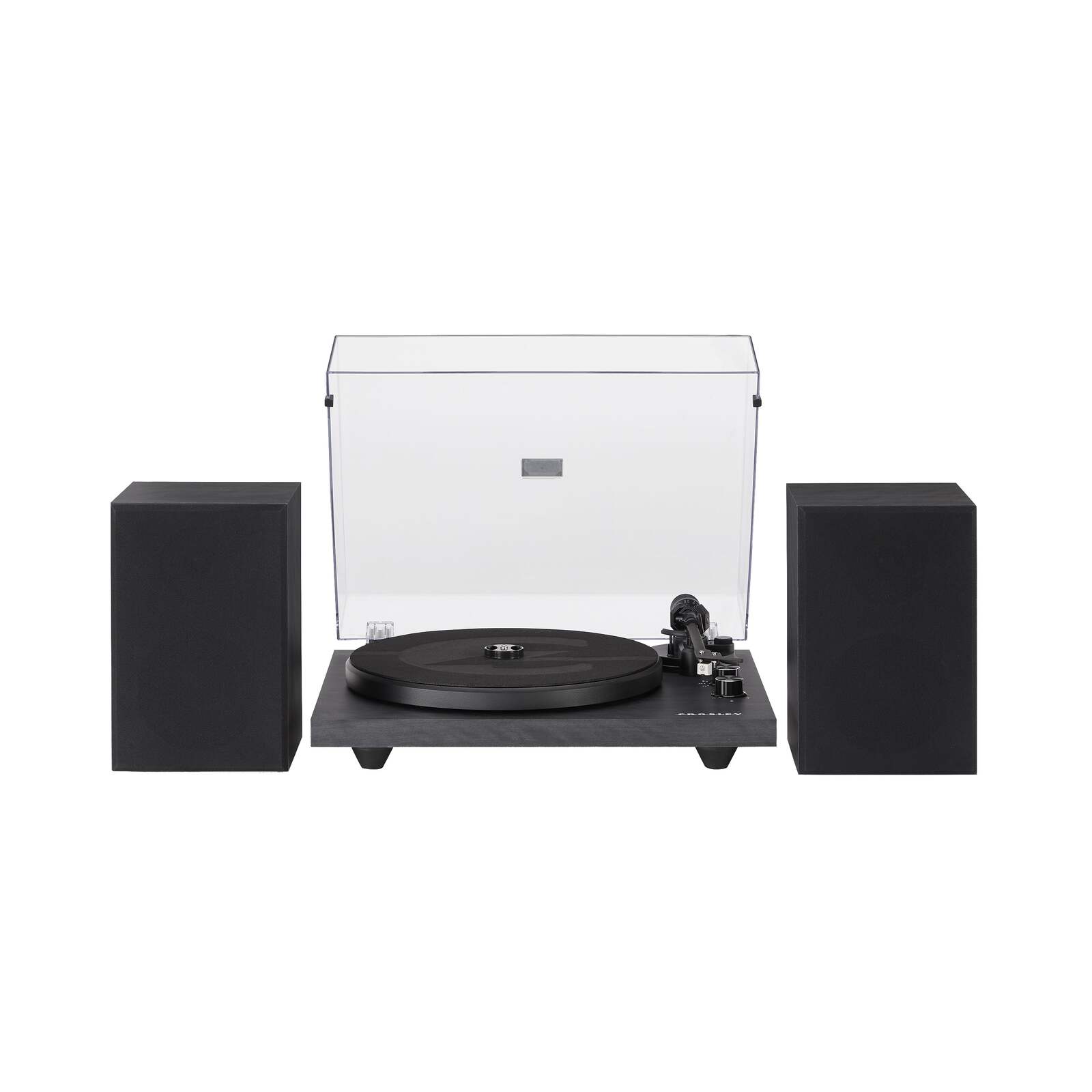 The Crosley C62 in Black was designed to be a ready-to-go-sounds-darn-good-straight-out-of-the-box turntable system that doesn’t break the bank. This fully manual two-speed (33 1/3 & 45 RPM) turntable sports an MDF plinth wrapped in a faux walnut veneer that would fool the best of lumberjacks.  The matching MDF speakers look just as good as the turntable and each rock a mid-range speaker and tweeter.  The matte black aluminum tonearm has an adjustable counterweight and comes pre-mounted with a moving magnet cartridge.  Of course, the cartridge is mounted with the standard 1/2” mount, so you can always upgrade your cartridge/stylus combo as your vinyl collection grows.  The record sits on a heavy steel platter that helps keep the C62 firmly planted on its three vibration control feet.  Take that, rouge vibrations!  The super minimal, two-knob design makes it easy to switch speeds, crank up the volume, and switch to the built-in Bluetooth receiver if you want to stream music from your favorite digital playlist. Whether you live in a sweet NYC loft or a teenage bedroom filled with angst, the C62 can hold its own.