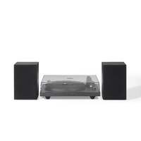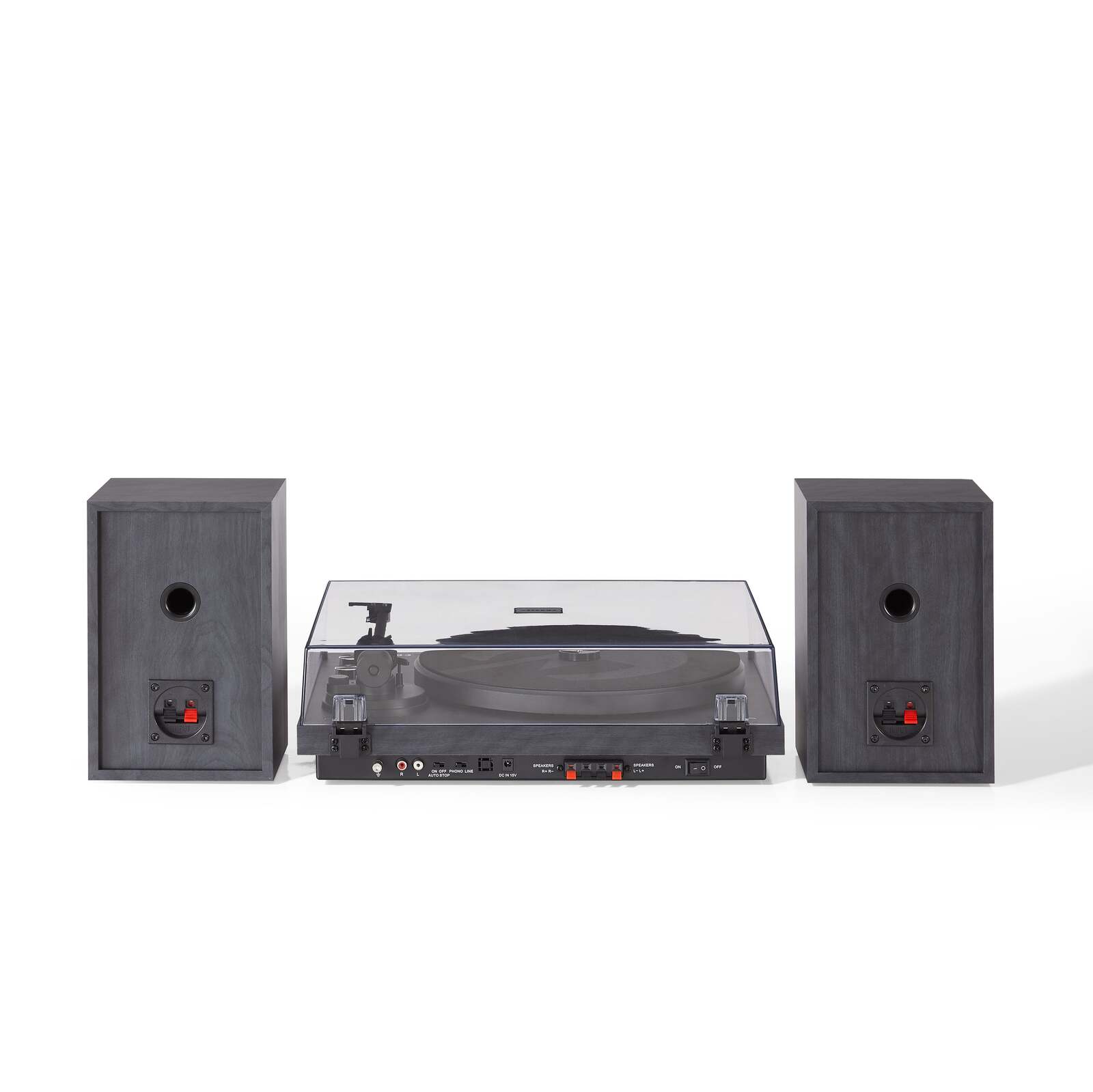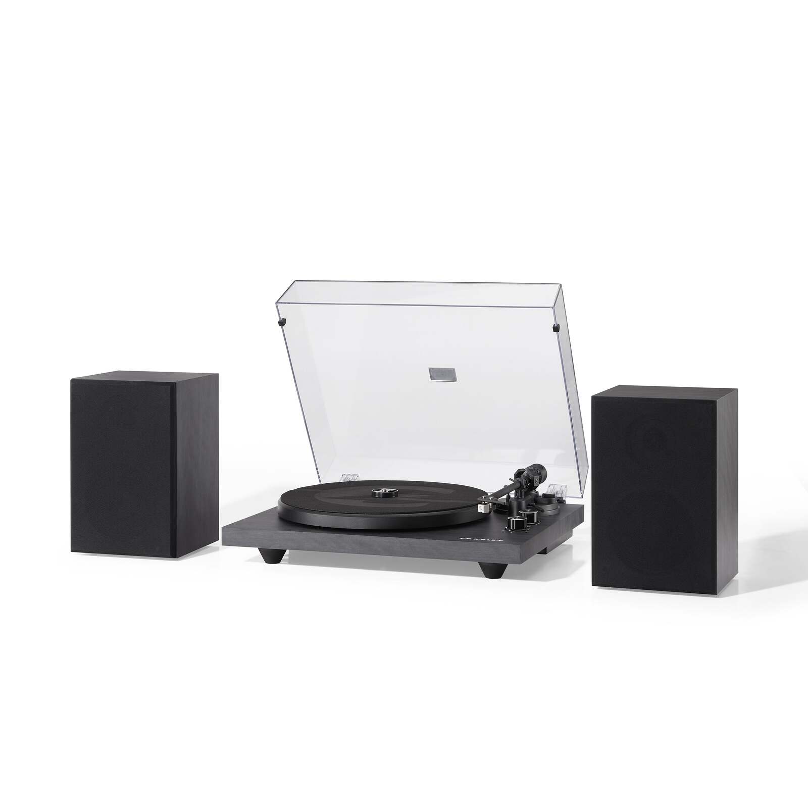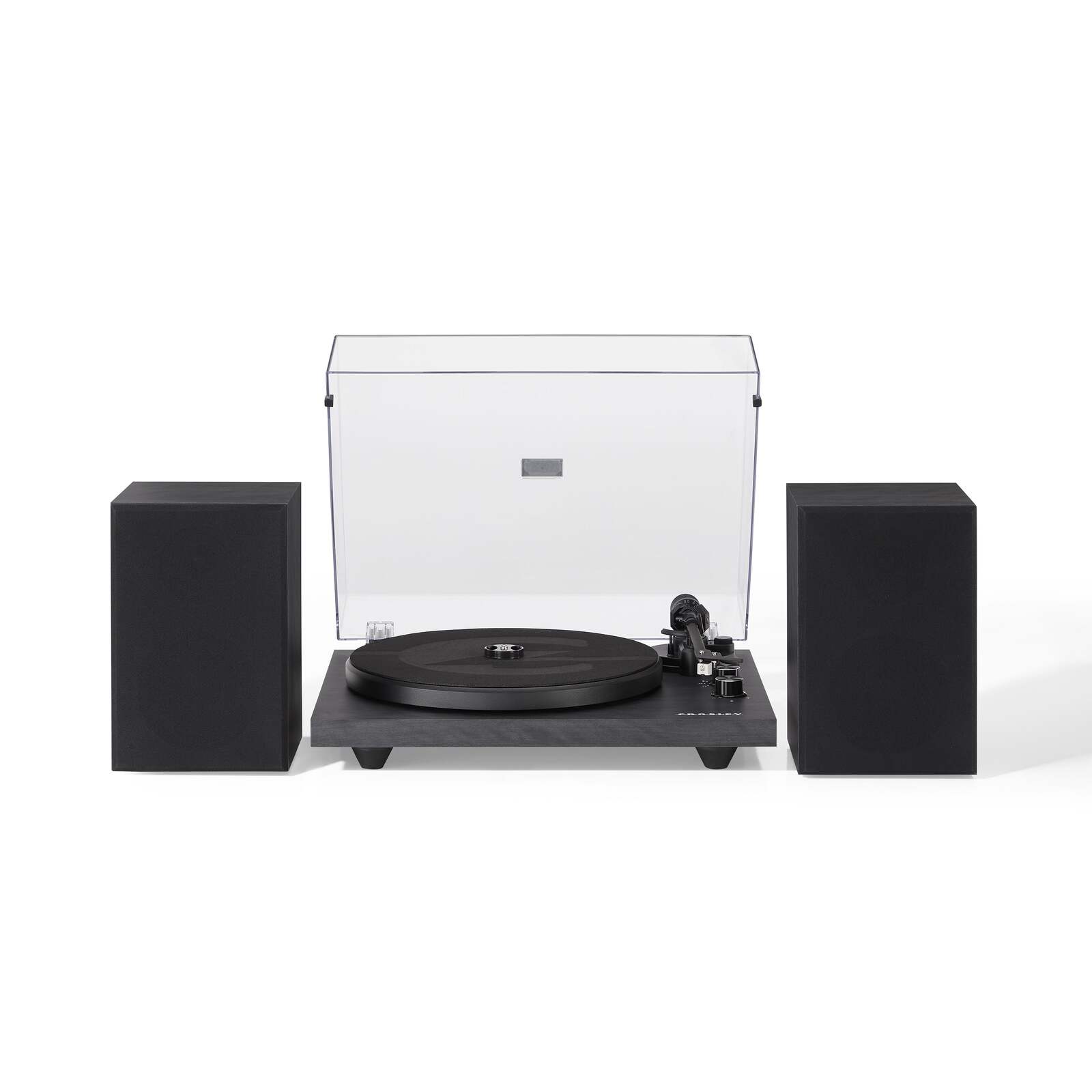 The Crosley C62 in Black was designed to be a ready-to-go-sounds-darn-good-straight-out-of-the-box turntable system that doesn’t break the bank. This fully manual two-speed (33 1/3 & 45 RPM) turntable sports an MDF plinth wrapped in a faux walnut veneer that would fool the best of lumberjacks.  The matching MDF speakers look just as good as the turntable and each rock a mid-range speaker and tweeter.  The matte black aluminum tonearm has an adjustable counterweight and comes pre-mounted with a moving magnet cartridge.  Of course, the cartridge is mounted with the standard 1/2” mount, so you can always upgrade your cartridge/stylus combo as your vinyl collection grows.  The record sits on a heavy steel platter that helps keep the C62 firmly planted on its three vibration control feet.  Take that, rouge vibrations!  The super minimal, two-knob design makes it easy to switch speeds, crank up the volume, and switch to the built-in Bluetooth receiver if you want to stream music from your favorite digital playlist. Whether you live in a sweet NYC loft or a teenage bedroom filled with angst, the C62 can hold its own.