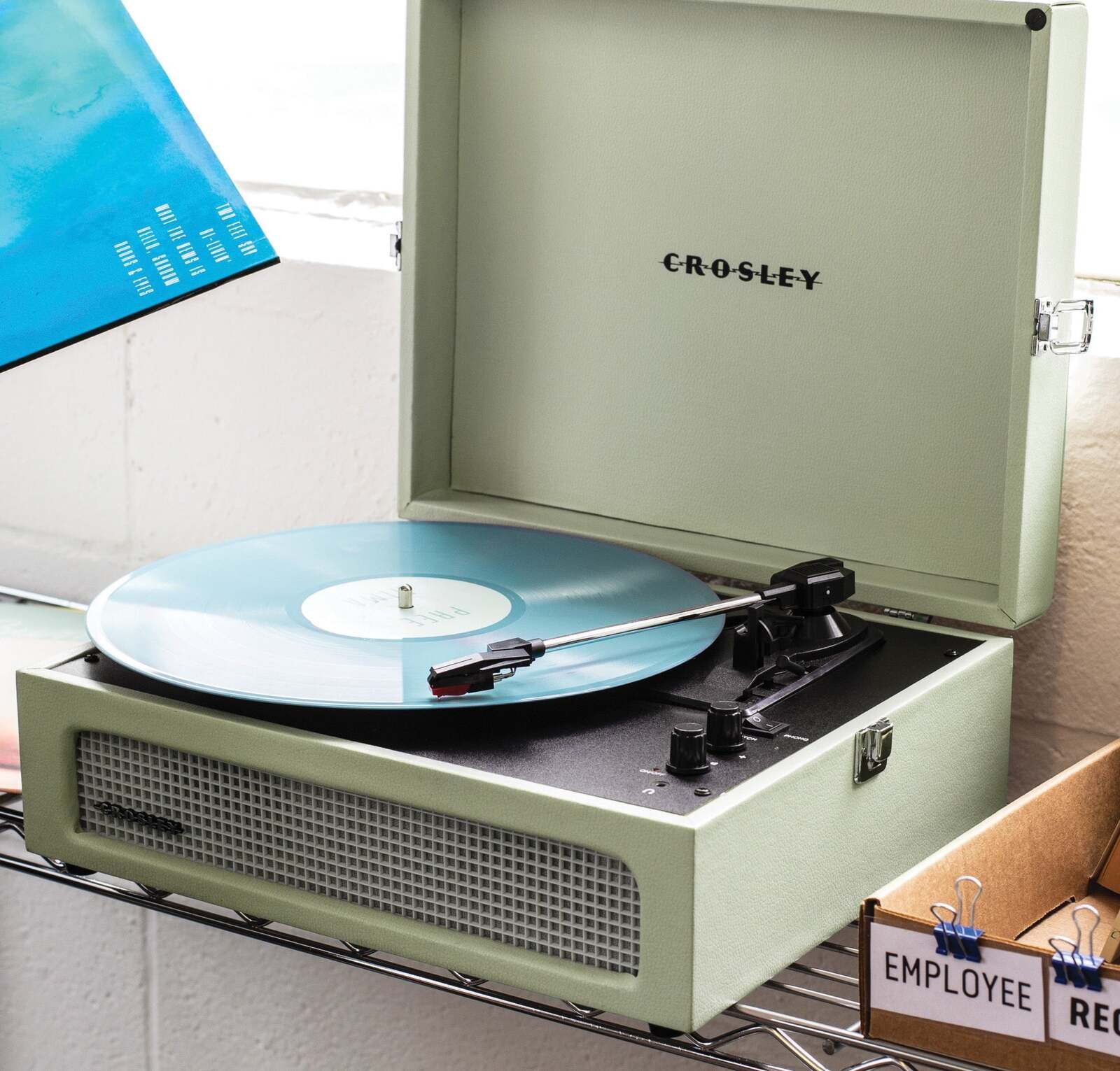 Crosley Voyager Sage - Bluetooth Portable Turntable  & Record Storage Crate.Join Crosley's mission to bring analogue music to the masses with the Crosley Voyager three-speed turntable. The clean, vintage-inspired aesthetic fits into any space, while the lightweight design allows this record player to travel “further than anyone, or anything in history.” Spin 33 1/3, 45, or 78 RPM records or launch the built-in Bluetooth transmitter or receiver to send  your digital music wirelessly. Discover the RCA outputs on the back that allow you to easily plug into your existing solar music system or bigger speakers to add propulsion to any party. Drop the needle on a reissue of the golden record, probe the adjustable pitch control knob to dial in the speed and prepare for blast off!