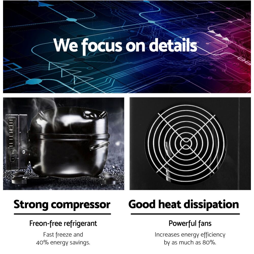 Freon-free refrigerant and enhanced heat dissipation enable low energy consumption