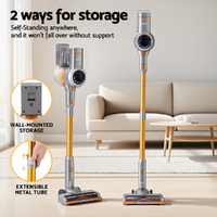 This vacuum is built for convenience and adaptability, featuring an extensible metal tube for reaching high or low spots and a free-standing design for easy storage. The 2200mAh Li-ion battery offers quick charging for extended runtime. With additional accessories like a sofa brush, crevice tool, and wall-mounted holder, your cleaning routine is elevated to the next level.