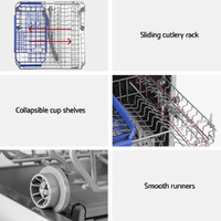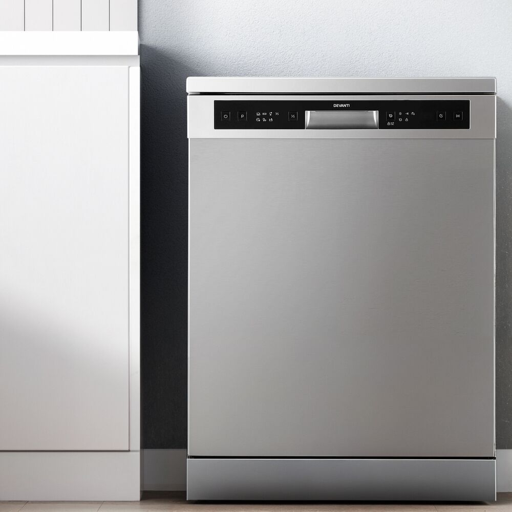Introducing our Devanti dishwasher, a powerful stand-alone dishwasher with a capacity for 14 place settings and a 4.5-star water rating. Featuring 6 cleaning programs and push-button controls with an LED display, this dishwasher is user-friendly and can be adjusted to your specific needs. The water softener and three-fold filter system ensure that your dishes come out sparkly clean. With an adjustable upper basket, child lock feature, delayed start function, and anti-flood device, this dishwasher is both convenient and safe. The dishwasher runs smoothly on basket runners and operates quietly, so it won't disturb your daily routine.