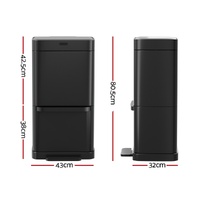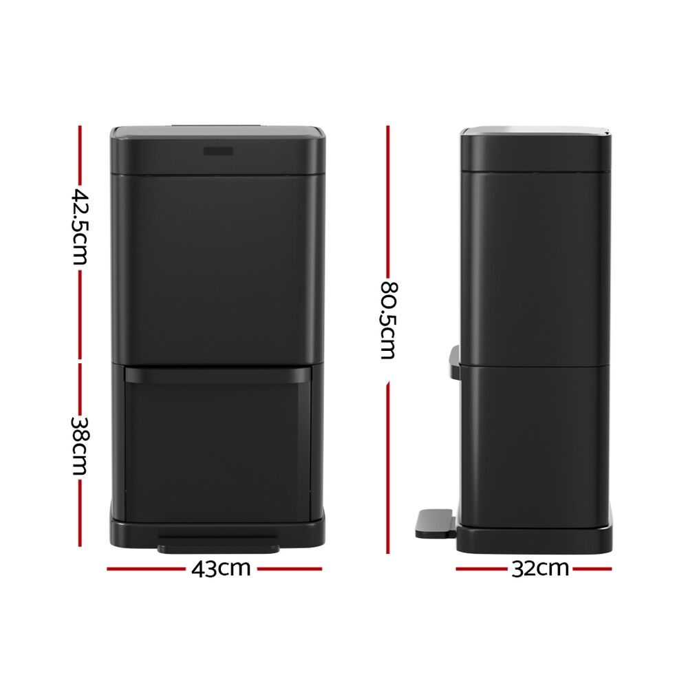 Keep your home clean, tidy and germ-free with a Devanti Recycling Motion Sensor Bin. Activated by just the wave of your hand (within a 20cm range) and a hands-free foot pedal, the motion sensor bin makes it easy to dispose of your trash cleanly and hygienically. With a large 70L capacity, you won't need to clear your bin immediately to make room for more trash. The bin is divided into two compartments so you can dispose of your trash and recycling separately. A removable divider for the top compartment helps keep your different recycling needs separate. A fingerprint-resistant black surface keeps your kitchen looking shiny and bright. No more worrying about the bin liner moving out of position with the convenient liner holder. The soft opening and closing make the bin completely noise-free. Keep your home (and the planet) clean and clear with a Recycling Motion Sensor Bin from Devanti.