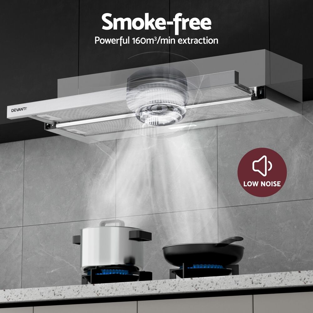 Do you suffer from stifling odours and stubborn smoke or steam from your cooking? Say goodbye to smells and stains with the Devanti 90cm Slide-out Range Hood. Made from Grade A stainless steel the range hood looks and functions perfectly for a busy kitchen. Featuring a powerful extraction rate of 160m/hr from a high-performance motor, our stainless-steel range hood will clear the air of smoke, steam, odours and vapours in no time. The non-stick and removable 3-layer aluminium grease filter ensures all grease is efficiently captured. Clear and bright LED lights provide vivid illumination for your cooking area, so you can see everything you're cooking. Completing the job is a 2-speed fan that can be easily selected with the push button controls. The range hood is easy to install and suitable for standard Australian plugs and both under-cabinet or wall-mounted installation. For clean and clear air in your home, you can't cook without a Devanti Slide-out Range Hood.