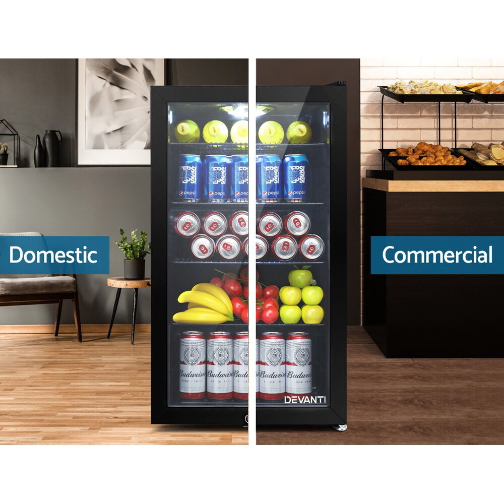 Our portable Devanti Bar Fridge is great for keeping a variety of food and beverages chilled and cooled without taking up too much space. Designed with seven temperature settings, the energy-efficient bar fridge lets you set your desired coolness and freshness. Other great features include adjustable shelves, double-glazed door, height-adjustable feet, built-in handle and consistent refrigeration to name a few. The compact bar fridge is also totally eco-friendly with its R600a freon-free refrigerant and well-made for robust use, such as the extra thick insulation and a built-in LED lamp to ensure operation is smooth, quiet and hassle-free. The fridge also comes with a built-in lock to keep the contents safe and secure, especially useful in a retail environment after you close for the night. Suitable for both domestic and commercial use, the Devanti bar fridge is a cool investment time and again.