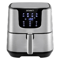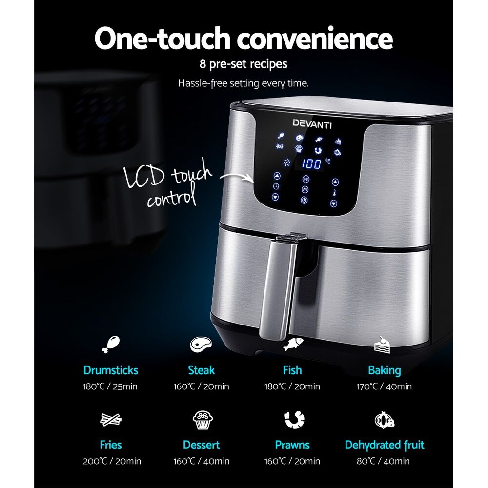 With its stunning and sleek stainless steel exterior, our Devanti Air Fryer turns the ordinary into the extraordinary. And that goes too for its exceptional cooking abilities. With its innovative air frying technology and 1700W of power, your cooking is done efficiently and thoroughly with less odours. Better still, all the wonderful cooking is done without a single drop of oil and yet is as delicious and sumptuous as traditional methods. In fact, foods cooked in in our air fryer have up to 80% less fat than deep-fried foods. This model has an all-in-one design and does not only fry food, but also roasts, grills and bakes. Just set in the cooking mode (up to eight to choose from) or time (up to 60 minutes) and temperature on the easy-to-use LCD touch controls, then leave all the hard work to the air fryer. Other great features include an auto shut-off function, non-stick pan and heat shield vent for good air circulation. The air fryer has a large 7L capacity making it suitable for most families. Most importantly, the components are dishwasher-safe, which makes the cleaning up process as easy as the cooking process.