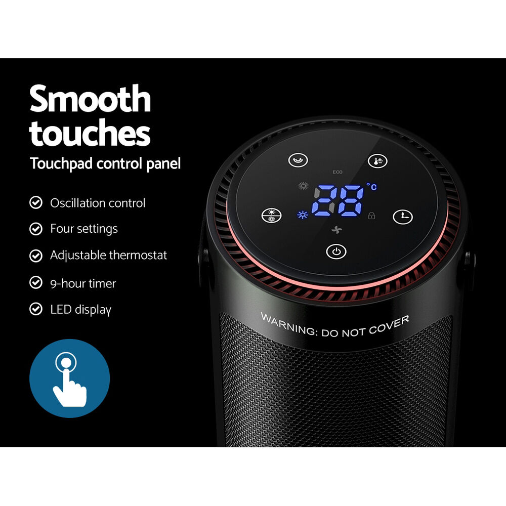Need a little extra heating to get through winter? The Devanti Ceramic Tower Heater is here to solve your winter blues. With its high-quality rapid PTC heating system and fan system, the heater will have you warm in no time at all. It has four unique modes (fan, warm air, hot air and ECO mode) so youre always at the perfect temperature. The ECO energy-saving mode cycles low and high heat at 24 degrees to save on energy costs. It uses wide-angle oscillation to evenly heat your space. Easily control the heater with the top touch control panel: adjust the thermostat, oscillation and heating mode at any time. Use the nine-hour timer with auto shut-off to strategically heat your home and save energy. Best of all, the heater has built-in safety features such as an anti-scald protective mesh, a safety cut-off switch in case of tipping and overheating protection. For maximum comfort and warmth through the winter months, you cant go wrong with a Devanti Ceramic Tower Heater.