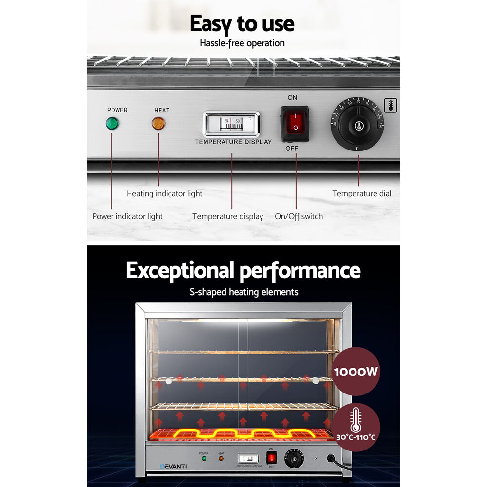 Put your best food forward with a Devanti Commercial Food Warmer. Four removable food-grade stainless-steel trays allow plenty of room to display your wares, while the rear sliding tempered glass doors give you easy access without hassle. An adjustable thermostat allows you to set the warmer between 30°C to 110°C for perfect temperature-controlled food, with the S-shaped heating element always keeping an even heat. With non-slip feet, anti-scald handles and overheating protection, you and your food will be protected during the busiest times. For the best and tastiest results, use a Devanti Commercial Food Warmer in your workplace today!