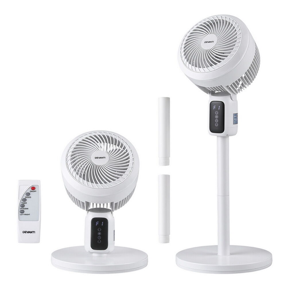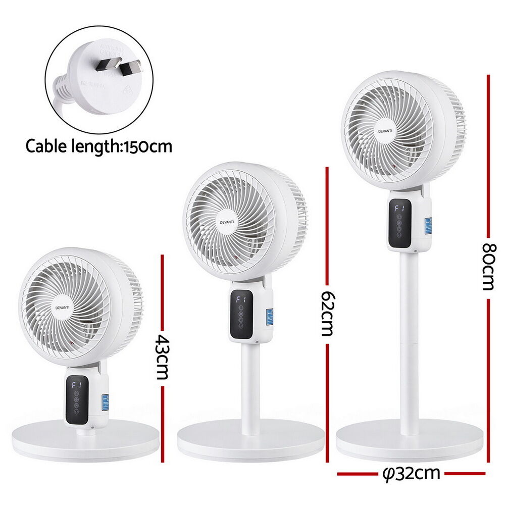 Stay cool and comfortable all year round with this Devanti pedestal fan with remote. Designed with height adjustment from 43cm to 80cm, it can be used as a compact mini fan for desktops or as a full-size pedestal fan for cooling larger areas. The 3D air circulation, combined with 45° vertical tilt and 90° horizontal swing, delivers wide coverage to every corner of the room.