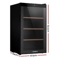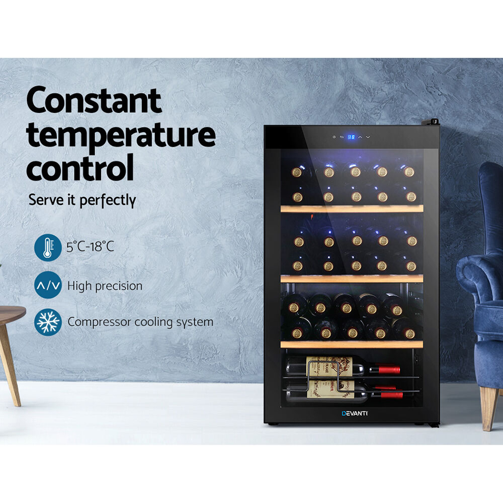 Need a good and reliable wine cooler? Look no further than our Devanti Wine Cooler. Utilising the latest high precision compression cooling technology, our wine cooler ensures your favourite vintages are kept at their prescribed temperatures with its circulated cool air. The touch control panel makes for easy temperature adjustments and the built-in interior LEDs help you to see your wines in the best light. The stylish and compact design stores up to 34 bottles of wine in a neat and tidy shelving system. The shelves are removable, allowing you to change the layout according to the contents and for easy cleaning. Better still, the double-glazed glass door is UV-resistant and provides excellent insulation along with the 30mm thick foam wall. The ensemble works quietly and efficiently and has a handy child-lock on its control panel for total peace of mind. Dont trust just any product with your precious vintages, trust Devanti.