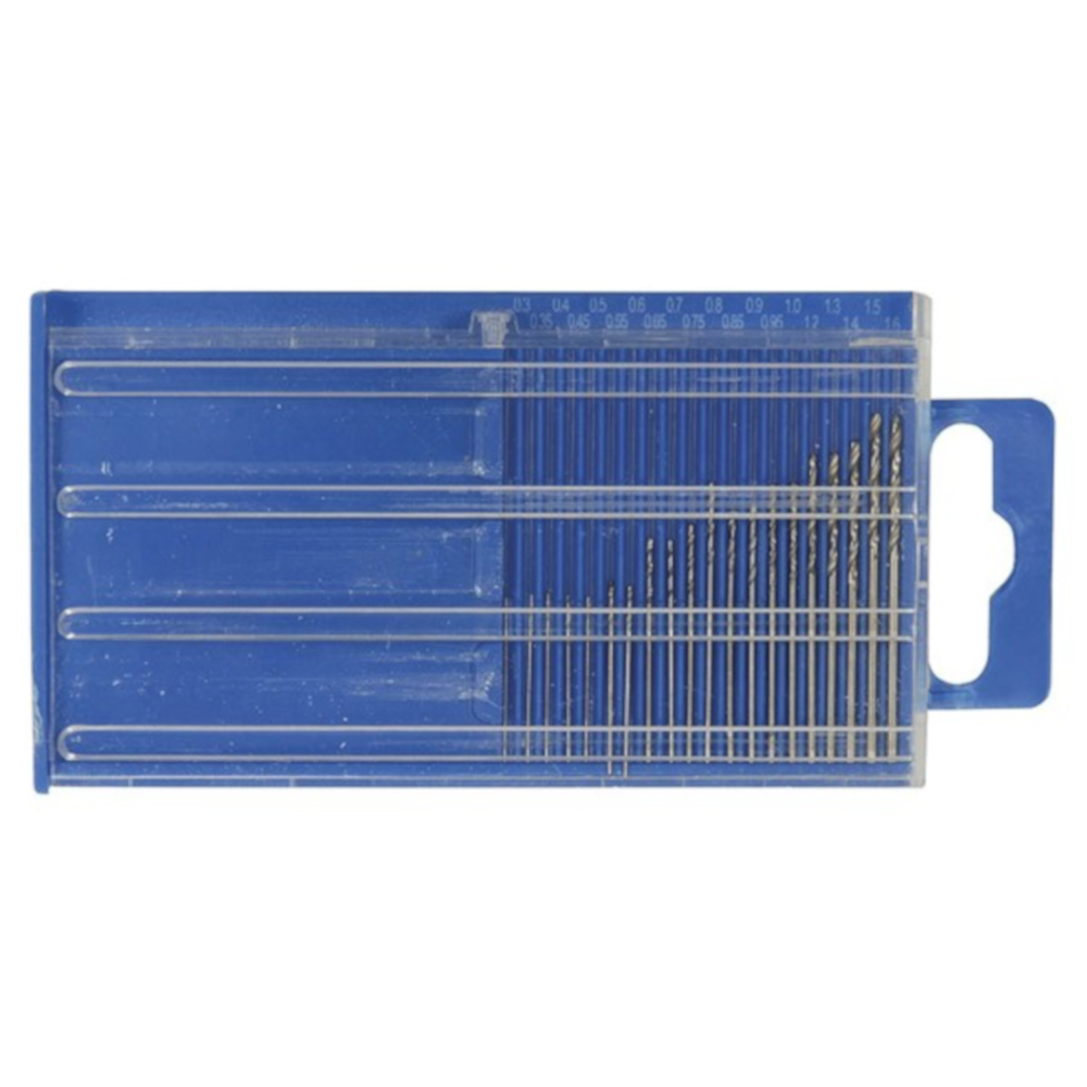 20 micro drills in indexing storage case, ideal for drilling wood, composites, plastic or soft metals. Indexed case enables removal of the bit you want without the risk of spilling them all over the place, because if you do, dang they'll be hard to find later!