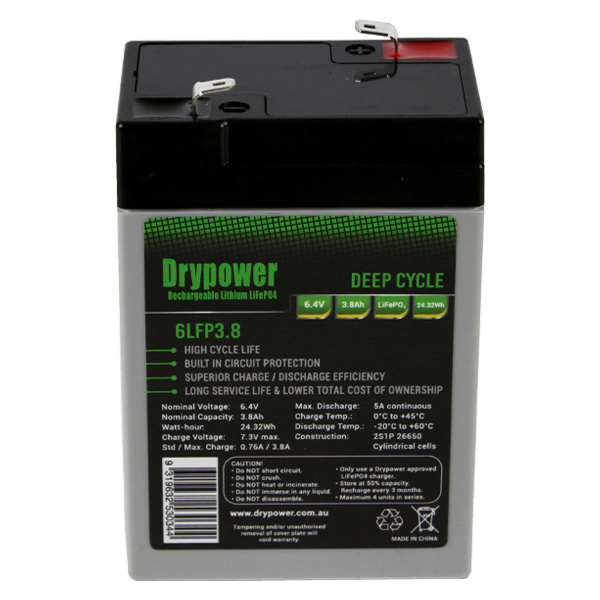 Drypower 6.4V 3.8Ah Lithium Iron Phosphate (LiFePO4) Rechargeable Lithium Battery - Up to 4 in Series Capable |