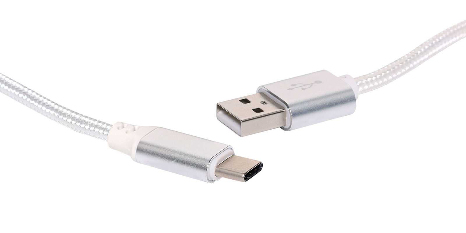 This USB 2.0 cable can be used to connect USB-C devices to USB-A type ports on computers or USB hubs. It can be used for both charging and data transfer purposes, supporting speeds up to 480Mbps (USB 2.0). White outer sheath with metallic finish plugs.