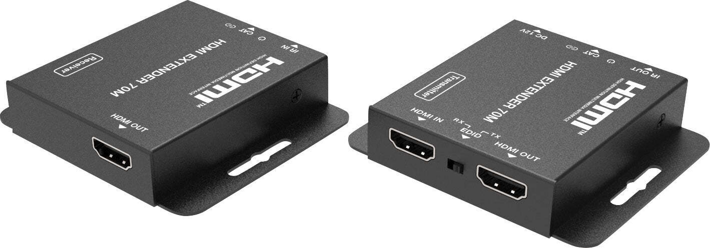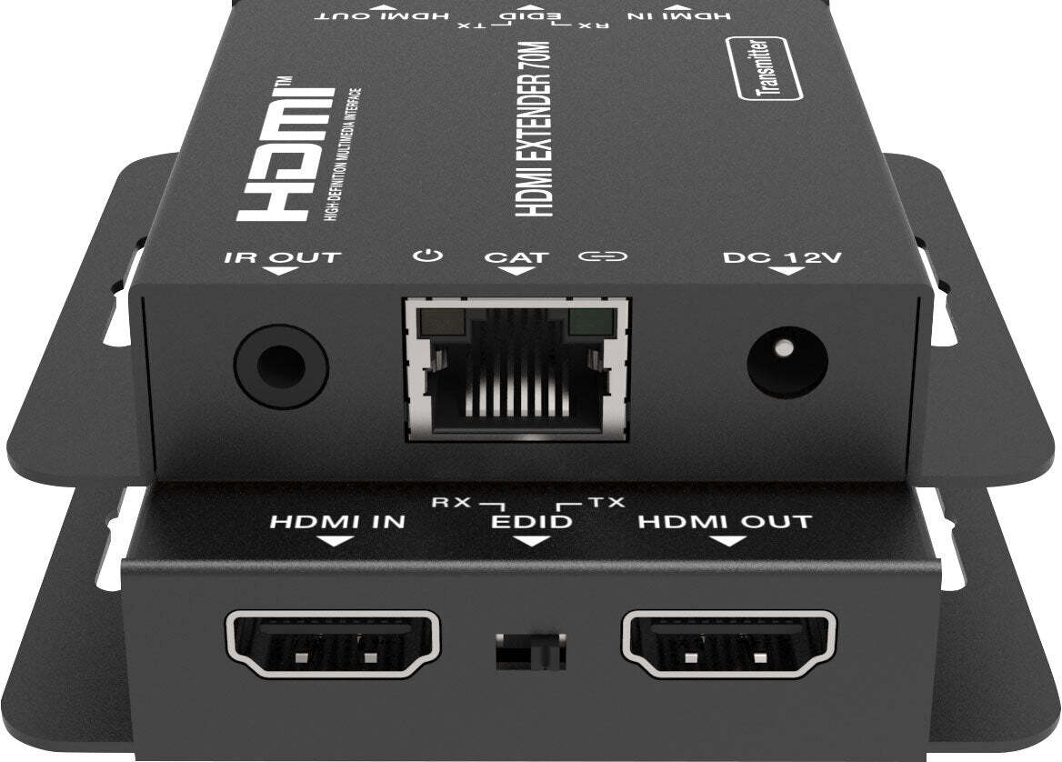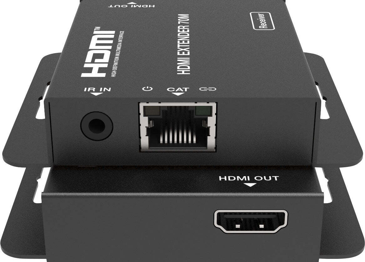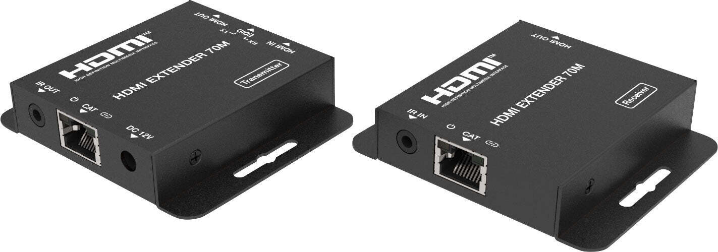 • Transmitter: Input: 1 x HDMI Type A [19-pin female], Outputs: 1 x HDMI Type A [19-pin female], 1 x IR OUT [3.5mm Stereo Mini-jack] 1 x CAT OUT [RJ45, 8-pin female]
