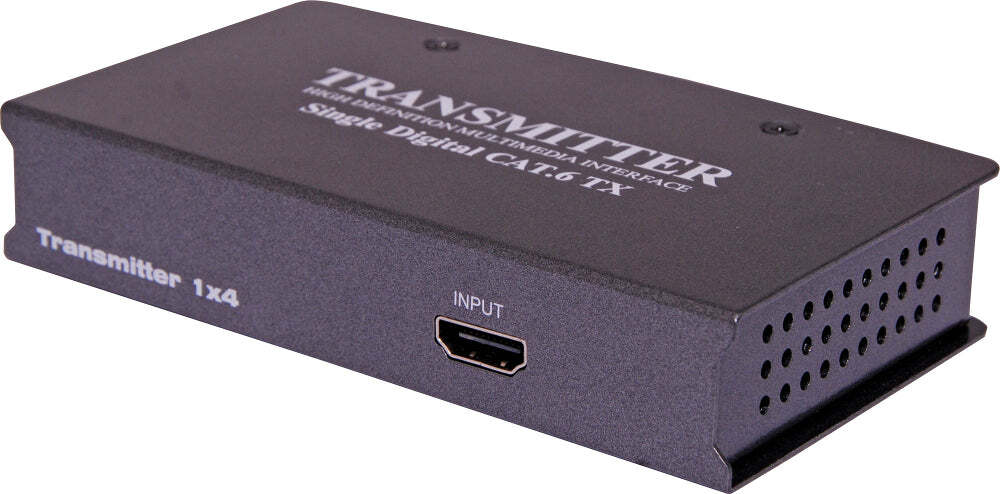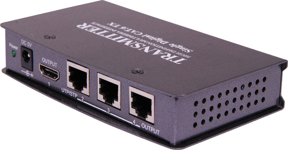 Transmitter: Accepts High Definition sources (Games platform, Blu-ray player (inc 3-D), DVD player, satellite receivers, digital projectors, A/V receivers and set up boxes) and transmits video and audio over Cat.6 up to 50m. HDMI connector input + HDMI output + 3x Cat. 6 outputs. Power Supply 5V 2A.